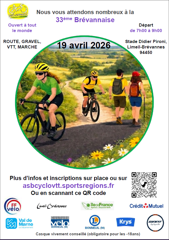L’AS Brévannaise est heureuse de vous accueillir pour sa 33ème Brévannaise. Cette année, en plus de ses parcours route, VTT et marche, une NOUVEAUTE: 2 parcours GRAVEL. Nous vous attendons nombreux